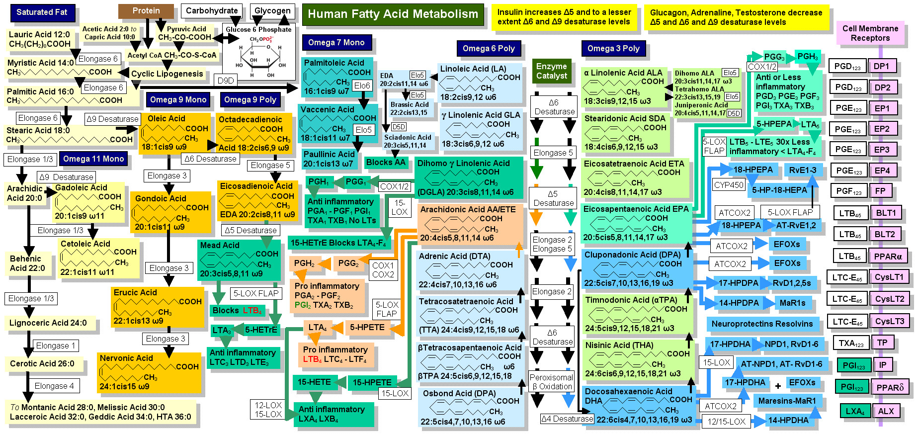Linoleic Acid (LA) is the essential Omega6 fat and Alpha Linolenic Acid (ALA) is the essential Omega3 fat for humans. This is because the body can make neither of them and it makes nearly all Omega3 and Omega6 fats from these two precursors. Sat fats and Mono fat are not essential because we manufacture Palmitic Acid from excess Carb or Protein which we cannot find storage space for and we can convert Palmitic Acid to Oleic Acid via Stearic Acid or via Palmitoleic Acid using the Delta 9 desaturase enzyme and the Elongase 1 or Elongase 3 or Elongase 6 enzyme. Here is how we do all of this...