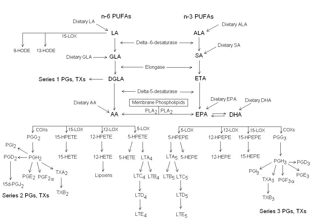 The trouble is that Delta 5 desaturase works a bit faster than delta 6 desturase and that delta 6 deaturase production declines with age, whereas delta 5 desaturase production does not. So if you are over 50 then your body will be slightly too inflamed due to having less delta 6 desaturase than when you were younger. But then if you double your insulin levels, the discrepancy between delta 5 and delta 6 desaturases will be doubled. You will then become doubly inflamed. But that very inflammation causes more insulin resistance which requires more insulin which causes more inflammation and there is the cycle, the positive feedback loop which is the cause of Type 2 Diabetes. T2D patients are lacking in anti inflammatory DGLA cytokines which are Series 1 Prostaglandins and Series 1 Thromboxanes. And they have an excess of pro inflammatory AA cytokines which are series 2 Prostaglandins, series 2 Thromboxanes and series 4 Leukotrienes.