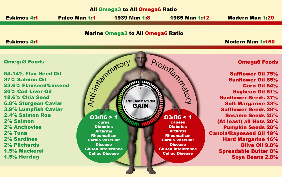 Modern man has an Omega6:Omega3 ratio of 20:1. Paleolithic man had around 1:1 and Eskimo's have around 1:4. Nutritionists advise that we should be perhaps 2:1 or 3:1 today. That would apply to non diabetic healthy people. For T2D the ideal is to get blood Omega3:Omega6 to be less than 1. This is measured by the Eicosapentaenoic Acid to Arachidonic Acid ratio in your blood, your serum..