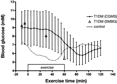 Here is a graph showing blood sugar versus spin bike exercise time for a normal person and for a group of Type 1 diabetics. Inclining the treadmill does not help with Diabetes.