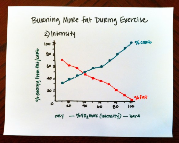 The dotted line is for a normal person. He starts burning fat at the 40 minute point when his blood sugar starts rising. The solid line is for the diabetics who continue to burn carbs and sugar until the 90th minute. This is because if you have high blood sugar then exercise will burn that first. The clearest illustrations I have seen which help us to determine when fat is burnt and when carbs are burnt are these two hand drawn graphs...